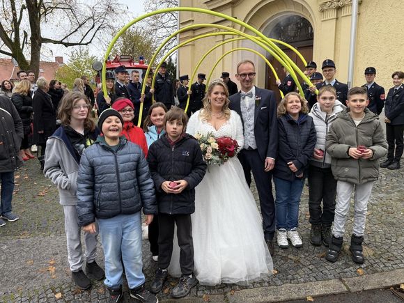 Don Bosco-Kinder der Klassen K4 und K5 warten vor der Kirche auf ihre Lehrerin. Sie stellen sich zu einem Spalier aus alten Tafellinealen, Zeigestäben, Zirkeln und Geodreiecken auf. Sie übergeben ihrer Lehrerin und ihrem Maximilian eine Blume und einen Wunsch. Die gesamte Don Bosco-Familie wünscht alles Liebe und Gute!!!